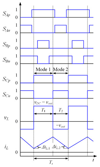 Figure 4 shows the inductor voltage and current waveforms depending on the switching state of integrated OBC. Firstly, each leg of the full-bridge converter composed of SAp, SAn, SBp, and SBn is independently operated with a duty ratio determined by control of vDC and ig. Secondly, the operation of the buck converter can be divided into two modes, as shown in Figure 3, depending on the switching state of SCp and SCn. The SCp is ON state during T1 in mode 1 and the SCn is ON state during T2 in mode 2. Additionally, T1 and T2 are determined by D as in (4):