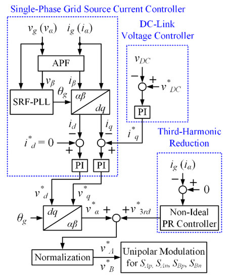 Figure 6 shows the control block diagram for the full-bridge converter of integrated OBC which performs battery charging. It is mainly classified into DC-link voltage controller, single-phase grid source current controller, and third-harmonic reduction [30]. The vDC is controlled to reference DC-link voltage (v*DC) using the voltage controller, and the d-q axis currents (id and iq) are controlled to reference d-q axis current (i*d and i*q) using the current controller, respectively. In addition, i*d is set to zero for a unit power factor control of the single-phase grid source. The non-ideal proportional-resonant (PR) controller in third-harmonic reduction is suitable to reduce the third-harmonic component included in ig, which is close to the fundamental component of ig, because it has narrow frequency bandwidth [31]. As a result, the full-bridge converter of integrated OBC performs AC-DC power conversion between the single-phase grid source and the DC-link.