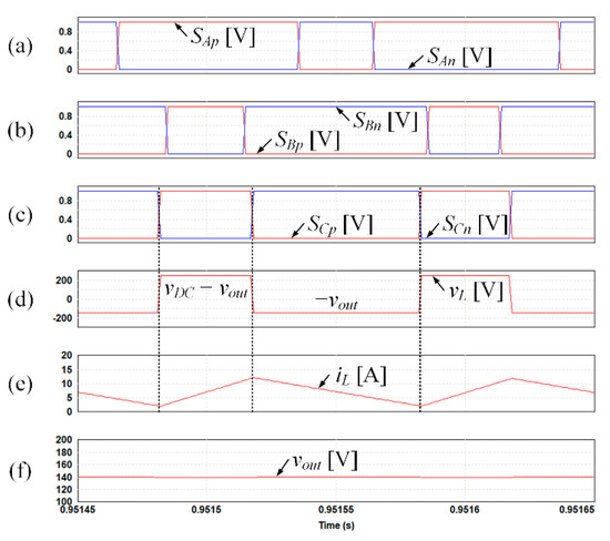 Figure 8 shows the simulation results of operation principles depending on the switching state of integrated OBC when vout is controlled to 140 V as shown in Figure 8f. Figure 8a,b indicate the switching state of SAp, SAn, SBp, and SBn of the full-bridge converter, which is determined by control of vDC and ig. Figure 8c indicates the switching state of SCp and SCn of the buck converter, which is determined by control of vout with the proposed MPC method. Figure 8d indicates vL, which is determined as positive or negative depending on the switching state of SCp and SCn. Finally, iL, as shown in Figure 8e, increases or decreases depending on vL.