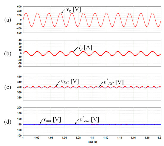 Figure 9 shows the simulation results of integrated OBC which performs battery charging. Figure 9a,b indicate vg and ig. In addition, vg is set to 220 Vrms/60 Hz. Figure 9c,d indicate vDC and vout, respectively. The vDC is controlled to v*DC, which is set to 400 V, using the full-bridge converter. Additionally, the vout is controlled to v*out, which is set to 140 V, using the buck converter. In Figure 9c, a fluctuation of vDC as the second-harmonic component is generated by the full-bridge converter with the single-phase grid source. It can be decreased by using a reduction technique with the PR controller and feedforward compensation [32,33]; however, it is not considered in this paper.