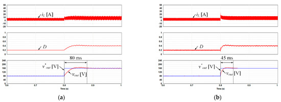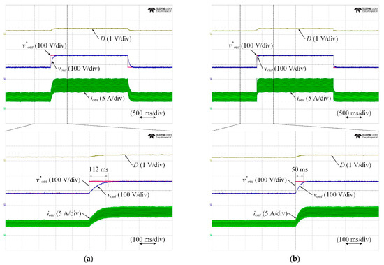 Figure 10 shows the simulation results of output voltage control of integrated OBC using (a) PI control and (b) the proposed MPC method. It indicates iL, D, vout, and v*out, which is changed to 160 V from 80 V at 0.8 s. In Figure 10a, the vout of integrated OBC is controlled to v*out using the PI control, and the settling time to reach 160 V is approximately 80 ms in the transient state. If the gain of the PI controller is increased for the dynamic characteristic improvement of integrated OBC, the control of integrated OBC will become unstable [25,26,27]. Therefore, the bandwidth of the output voltage controller based on the PI controller was set to 1/40 times of the switching frequency and the bandwidth of the output current controller was set to 1/5 times of the bandwidth of the output voltage controller. In Figure 10b, the gain of the output voltage controller based on the PI control is identical to that in Figure 10a and the vout of the integrated OBC is controlled to v*out using the proposed MPC method. The settling time to reach 160 V is approximately 45 ms in the transient state. Compared with that in Figure 10a, the dynamic characteristic improvement of integrated OBC is achieved by using the proposed MPC method.