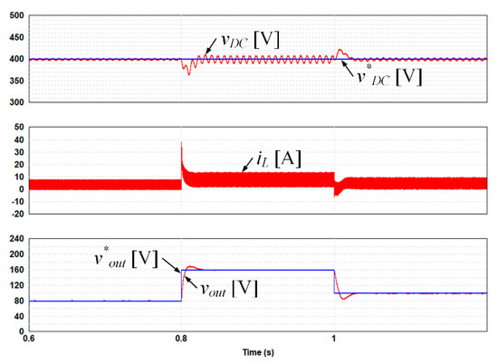 Figure 11 shows the simulation results of output voltage control of integrated OBC using the proposed MPC method. It indicates vDC, v*DC, iL, vout, and v*out, which are changed to 160 V from 80 V at 0.8 s and to 100 V from 160 V at 1.0 s. The vout of integrated OBC is controlled to v*out using the proposed MPC method and the robustness of the proposed MPC method is verified by simulation results.