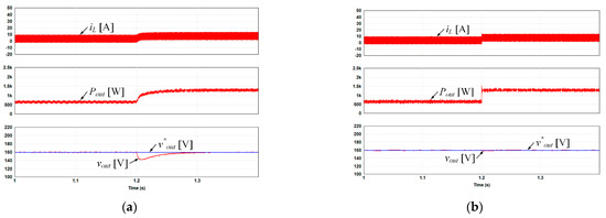 Figure 12 shows the simulation results of output voltage control of integrated OBC when the load impedance is abruptly changed (a) without a feedforward component of output power and (b) with a feedforward component of output power. It indicates iL, Pout, vout, and v*out, which are set to 160 V. The vout of integrated OBC is controlled to v*out using the proposed MPC method and the load impedance is abruptly changed to 20 Ω from 40 Ω at 1.2 s. In Figure 12a, vout fluctuates greatly when the load impedance is abruptly changed. However, in Figure 12b, vout does not fluctuate, although the load impedance is abruptly changed because the feedforward component of output power is applied to the proposed MPC method.