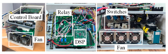 The experiments were performed to verify the effectiveness of the proposed MPC method for integrated OBC. Figure 13 shows the experimental setup, which is composed of a control board with a digital signal processor (DSP) using the TMS320F28335, fans, relays, and switches. The IGBT modules are designed by SKM75GB12T4 (1200 V/75 A) from Semikron considering vDC of 400 V as the DC-link voltage. The experimental parameters were identical to those of the simulation as listed in Table 2. However, to extend the power ranges for a real HEV/PHEV, not only the inductance and capacitance of elements comprising the experimental setup, but also the rated voltage and current of devices, should be increased considering the detailed specification of integrated OBC for a real HEV/PHEV.