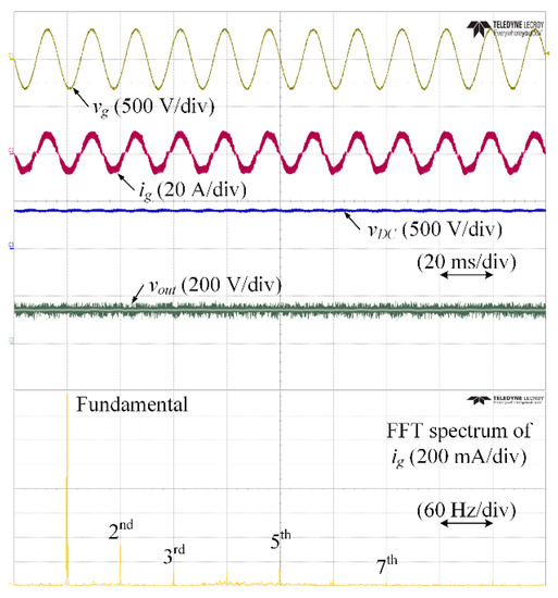 Figure 14 shows the experimental results of integrated OBC which performs battery charging. The vg is set to 220 Vrms/60 Hz and vDC is controlled to 400 V using the full-bridge converter. Additionally, unit power factor control of the single-phase grid source is performed, and the third-harmonic component included in ig is reduced by the non-ideal PR controller as shown in the FFT spectrum in Figure 14. Since the power factor of the single-phase grid source and harmonic components are affected by the control of the full-bridge converter, the power quality of the grid side is not influenced by the PI controller and the proposed MPC method. Finally, the vout is controlled to 160 V using the buck converter.