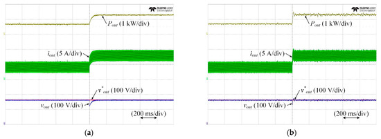 Figure 16 shows the experimental results of output voltage control of integrated OBC when the load impedance is abruptly changed (a) without a feedforward component of output power and (b) with a feedforward component of output power. The vout is controlled to v*out, which is set to 160 V, using the proposed MPC method and the load impedance is abruptly changed to 20 Ω from 40 Ω. The vout fluctuates greatly when the load impedance is abruptly changed in Figure 16a; however, the vout does not fluctuate, although the load impedance is abruptly changed because the feedforward component of output power is applied to the proposed MPC method in Figure 16b.