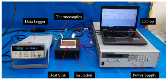 The experimental setup consists of an aluminum heat sink with dimensions of 110 × 110 × 29 mm with a wall thickness of 4 mm. The heat sink is insulated with a fiber rubber block from all sides to prevent heat loss and allow for unidirectional heat flow from bottom to top. Heat sink is covered with a copper plate of 2 mm thickness, for improving heat dissipation rate. Silicon rubber fiberglass insulated heater (OMEGALUX SRFG-404/10-P-220V) of dimension 100 × 100 × 1.5 mm is used to imitate the heat generation by an electrical chipset and adhered at the rear end of heat sink by thermal paste. Pre calibrated 8 K type thermocouples (Omega, AWG-24, 0.5 mm wire diameter), temperature sensitivity between (−50 to 1350 C) are inserted in various points in heat sink for temperature measurement. The thermocouple temperatures are recorded after every 5 s using Agilent (34972A) data acquisition unit. The silicon rubber heater is powered by DC power supply (Keysight Technologies 6675A) with a voltage range of 0–120 V and a current range of 0–18 A. To evaluate the thermal performance of heat sink, three heating inputs 0.77 kW/, 1.54 kW/, and 2.3 kW/ (8 W, 16 W and 24 W) are opted which indicate the conventional power levels for operating electronic equipment with low to high power ratings. Ohm’s law is applied for voltage estimation and a multimeter is used to measure the electrical power from DC supply. Before the start of experimentation, it was ensured that the heat sink temperature was retained at 28 C. Schematic diagram and photographic view of the experimental setup are presented in Figure 1 and Figure 2, respectively. The exploded view of heat sink assembly for present study in shown in Figure 3.