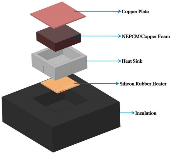 A comparison between 90 min charging and 90 min discharging of heat sink is conducted by employing different arrangements of heat sink, e.g., empty heat sink, PCM, PCM/copper foam (copper foam), NEPCM, NEPCM/copper foam packed heat sink. The thermal evaluation uses three power levels of 8 W, 16 W and 24 W. The heat sink is discharged in the same way as it is charged, with insulating sidewalls and base enabling one-dimensional heat flow from bottom to top for thermal analysis, and copper plate of 2 mm thickness covered the heat sink top to improve heat dissipation.