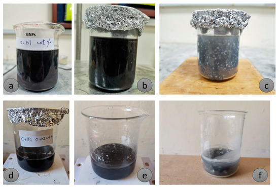 GNPs samples: [0.01 wt. (a) after preparation; (b) after 30 min; (c) in solid form]; [0.02 wt. (d) after preparation; (e) after 30 min; (f) in solid form].