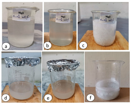 MgO samples: [0.01 wt. (a) after preparation; (b) after 30 min; (c) in solid form]; [0.02 wt. (d) after preparation; (e) after 30 min; (f) in solid form].