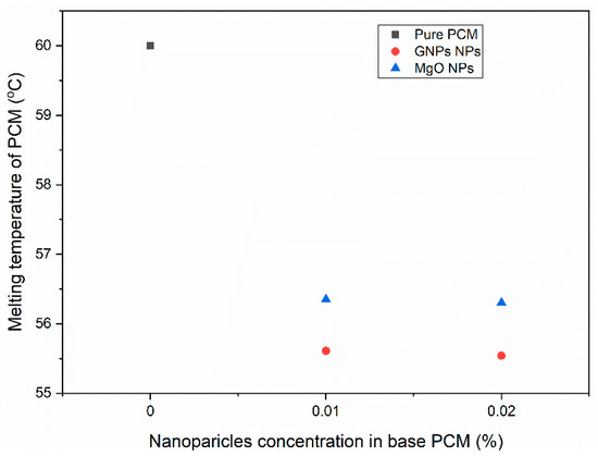The melting temperature of each nano-PCM after adding NPs in base PCM is shown in Figure 10. It is clear that the melting temperature of GNPs/PCM based nano-PCM is reduced most as compared to other MgO/PCM and base PCM.