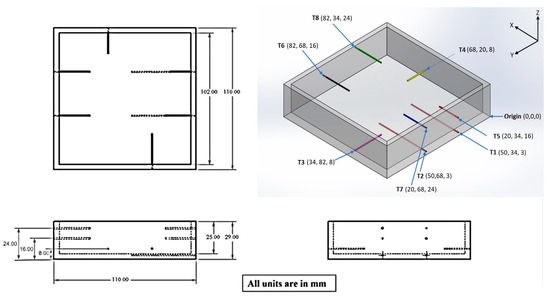 Highly sensitive and pre calibrated 8 K type thermocouples are positioned around the walls and base of the heat sink to analyze heat dissipation behavior of heat sink. The thermocouples are affixed to the heat sink sidewalls and base via 1 mm holes, using temperature-resistant epoxy adhesive to make them immovable and leakage proof. The positioning of thermocouples in heat sink is according to a previous study done on a heat sink of the same dimensions [30]. To measure the base temperature, two thermocouples , 33.3 mm apart, are implanted in 3 × 1 slots at the base of the heat sink. The thermocouples are positioned at 8 mm, positioned at 16 mm and positioned at 24 mm over the base of heat sink. For accurate temperature measurement within the heat sink, the thermocouples at the walls are implanted 20 mm inside the heat sink. The temperature was evaluated using the average temperature of two thermocouples mounted at the same height during the experimentation, and the ambient temperature was kept at 28 C. Table 3 presents the thermocouples positioning details. Figure 11 depicts the various isometric views of heat sink with thermocouple locations positioned inside heat sink.