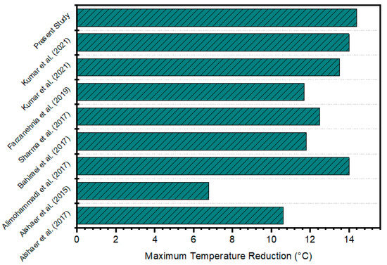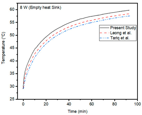 Before scrutinizing the results, the experimental setup is verified by comparative analysis of an empty heat sink to those of prior studies conducted by Leong et al. [32] and Tariq et al. [33]. The validation of the current study is compared with the paper by Leong et al. [32], as the same trend can be seen from this reference paper. The Figure 6 in the reference paper of Leong et al. [32] has the same temperature trend with empty heat sink. The temperature variation in empty heat sink for Leong et al. [32] was around 26–55 C, which is the same trend in the current research. Heat sink with inner dimensions of 102 × 102 × 25 mm and heating input of 8 W (0.77 kW/) are used to relate the results. To validate the results, the same experimental protocols are maintained. From Figure 12 it can be noticed that the current study and prior studies present a close agreement. The deviation of 6 to 7% in temperature profile is due to difference in ambient conditions and heating input variations. As a result, further research is being conducted to assess the heat sink effectiveness under different scenarios.