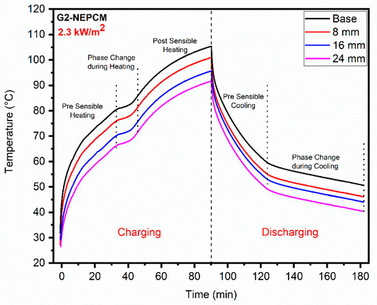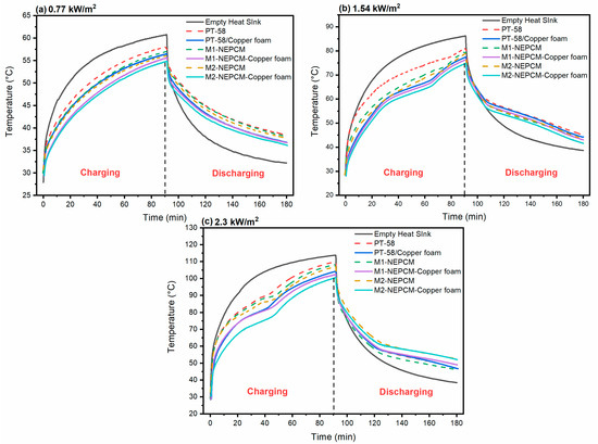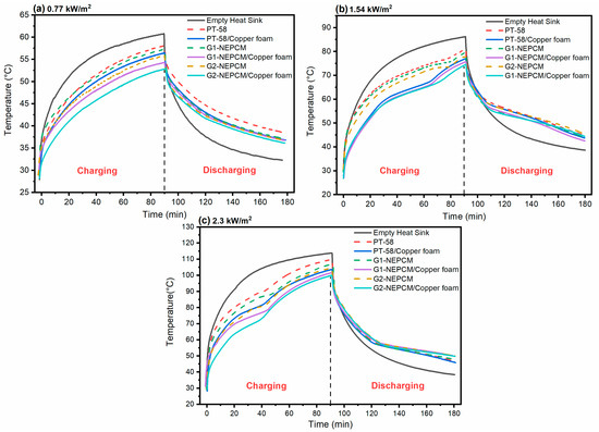 From Figure 13a, it is noted that when the empty heat sink reached the 60.77 C temperature at the end of charging period for 0.77 kW/, the maximum temperature reduction to 52.8 C was observed in the case of G2-NEPCM/copper foam composite. The inclusion of PCM, G1-NEPCM and G2-NEPCM in heat sink lowered the base temperature by 2.65 C, 3.49 C and 4.87 C, respectively. While the PCM/copper foam, G1-NEPCM/copper foam and G2-NEPCM/copper foam lowered the base temperature by 4.26 C, 6.45 C and 7.92 C, respectively. With the increase in concentration of NPs, the thermal responsiveness of PCM improved, with a moderate decrease in TES capacity, while the introduction of metal foam further enhanced the cooling performance of heat sink. For PCM and NEPCM composites, there was no phase change but only sensible heating until the end of charging period.