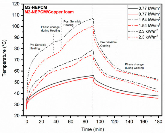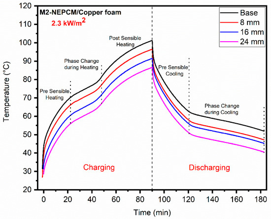 - Similarly, at heating input of 2.3 kW/ for M2-NEPCM, with and without copper foam, temperature reduction of 11.62% and 5.3% was noticed. At high heating load, PCM was completely melted for both NEPCM and NEPCM/copper foam cases, thus increasing the heat sink base temperature considerably. The discharging at this load was better in the case of M2-NEPCM, with and without copper foam cases.