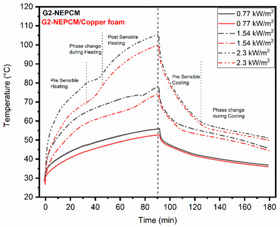 To study the heat sink thermal behavior at high heating load, the heating input of 2.3 kW/m2 was imparted, as depicted in Figure 13c. For empty heat sink case the temperature at the completion of the charging phase was 113.2 C, and at the end of discharging temperature was 38.4 C. At this power level, the introduction of PCM, G1-NEPCM and G2-NEPCM lowered the base temperature by 3.3 C, 6.13 C and 7.81 C, respectively. Similarly, by filling heat sink with PCM/copper foam, G1-NEPCM/copper foam and G2-NEPCM/copper foam lessened the base temperature by 9.41 C, 12.58 C and 14.32 C, respectively. The increase in NPs concentration in PCM lowered the base temperature, but the reduction was not much as at high heating load the NEPCM and NEPCM/copper foam composites completed their latent heating phase around 45 min of charging and underwent post-sensible heating. Similarly, at high heating load the stability of NPs in fully melted NEPCM started to deteriorate due to agglomeration and sedimentation, hence base temperature reduction was less effective.