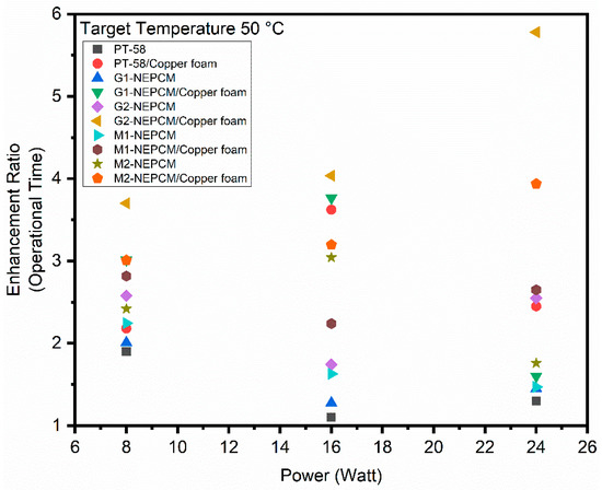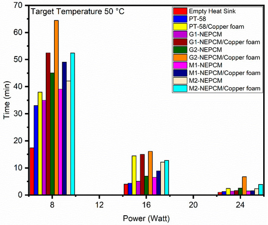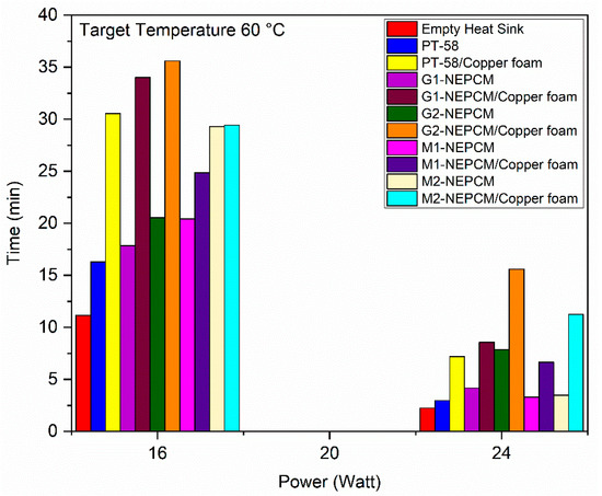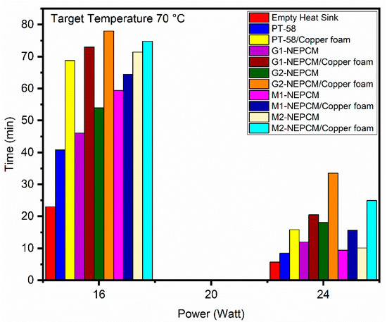 - Time required to achieve different target temperatures for various configurations of heat sink revealed that at 8 W power level, G2-NEPCM/copper foam took 64.4 min to reach 50 C target temperature. While at 16 W power level, the G2-NEPCM/copper foam showed best performance and took 78 min in achieving target temperature of 70 C. The M2-NEPCM/copper foam achieved target temperature of 70 C in 74.8 min. For 24 W power level, GNPs-NEPCM/copper foam took the highest time to achieve target temperatures of 50 C, 60 C, and 70 C;