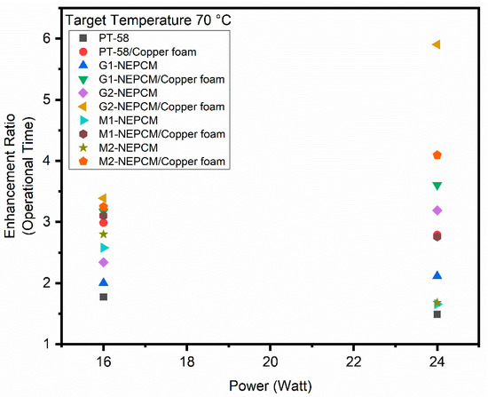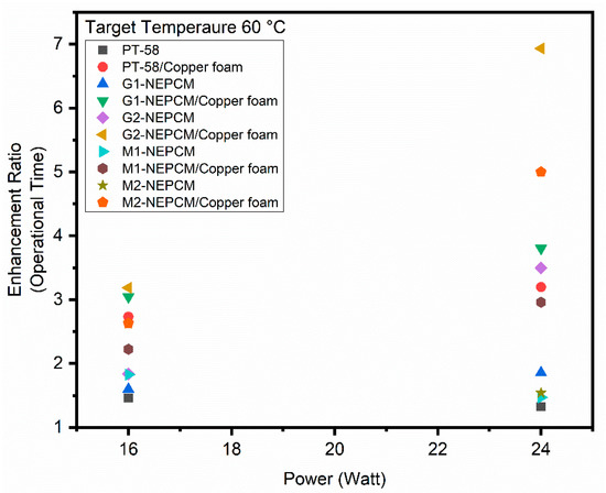 - The enhancement ratio study of heat sink indicated that dominance of NEPCM/copper foam-based heat sinks in general, and GNPs-NEPCM/copper foam specifically. The highest enhancement ratio of 5.8, 6.9 and 5.9 was observed for G2-NEPCM/copper foam at target temperatures of 50 C, 60 C and 70 C, respectively, at 24 W power level.