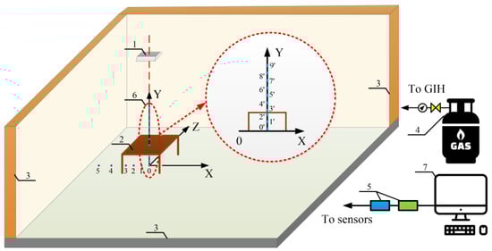 Scheme of the experimental area and thermocouple location: 1—GIH; 2—remote horizontal panel; 3—enclosing structures; 4—shut-off and control valves of the gas supply system; 5—analog-to-digital converter (NI 9214) and data collection and transmission system (DAQ 9181); 6—thermocouples (0′–9′ thermocouple numbers); 7—computer.