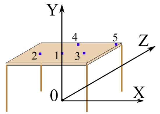 Thermocouples’ arrangement on the panel: 1—point under the GIH; 2—point at a distance of 0.3 m from the GIH center in the longitudinal direction; 3—point on the edge of the table in the longitudinal direction from the GIH center (0.6 m); 4—a point on the edge of the table in the transverse direction from the center of the GIH (0.28 m); 5—a point in the corner of the panel.