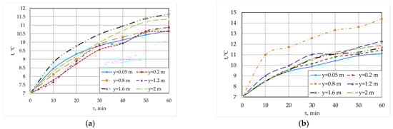 Air temperatures change with increasing time at the points of thermocouples’ location on the GIH symmetry axis: (a) premises without equipment; (b) the panel is located at a height of 0.755 m from the floor.