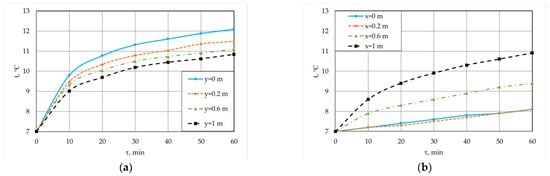 Floor surface temperatures change with increasing time at 0 ≤ X ≤ 1.0 m, Y = 0: (a) premises without equipment; (b) the panel is located at a height of 0.755 m from the floor.