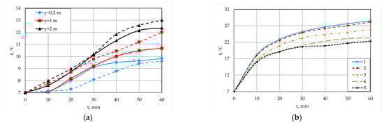 The floor surface temperatures in the central part of the GIH influence zone (Figure 4b) after 20 min of its operation change insignificantly, but with distance from the GIH symmetry axis, the temperature values decrease.
