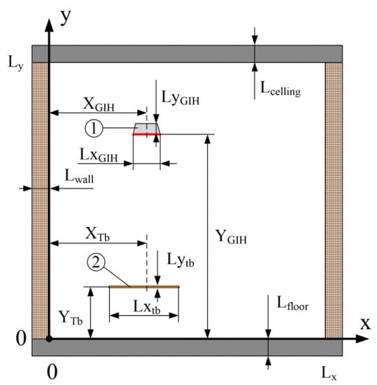 Numeric simulation was carried out in the framework of a two-dimensional approximation. We considered a rectangular area with dimensions Lx = 5 × Ly = 4.4 m, bounded by the floor, walls and ceiling (enclosing structures, Table 1) with a wall thickness of Lwall = 0.1 m (Figure 5) with two horizontal structural elements (Figure 6) corresponding to the GIH (dimensions LxGIH = 0.4 m, LyGIH = 0.05 m) and panel (dimensions Lxtb = 1.2 m, Lytb = 0.04 m).