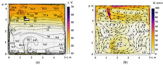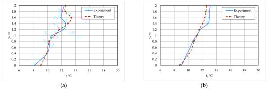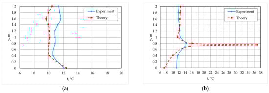 The temperature distributions to the left and to the right of the panel at the same distance of 0.2 m (X = (XTb − LxTb/2) ± 0.2 m), obtained as a result of experimental and numerical studies, are shown in Figure 9. It can be noted that the data have good correspondence along the Y coordinate. At a height of Y = 1.2–1.6 m, a slight increase in temperature values is noticeable both in numerical studies and in the experiments (Figure 10). This is due to the formation of a large-scale circulation vortex in the area under study. The temperature change along with the height to the left of the panel is more pronounced (Figure 10a). This phenomenon is related to the fact that the flow of air heated from the panel, rising upwards, deviates to the left and turns out to be in the section X = 0.8 m at a height Y = 1.2–1.6 m from the floor (Figure 8b). The temperature increase to the right of the panel at the same height (Figure 10b) is also caused by the vortex circulation flow.