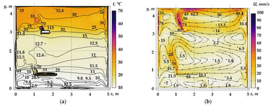 Figure 7 shows the temperature and velocities fields calculated as a result of solving the problem formulated above for a premises without equipment. The results are given for the area heated by a gas infrared heater after reaching stationary values of the main process characteristics.