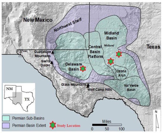 The Permian Basin located in the West Texas region become one of the most productive energy regions in the world. The geographic region is shown in Figure 1. The basin reserve is reported about 92.3 billion barrels of oil and 300 trillion cubic feet of natural gas which is 38 times Alaska’s reserves and forecasted capable of meeting U.S. energy demand for 60 years [48]. However, the basin continuously faces severe technical challenges during the drilling, completion, and fracturing. In addition, there is a knowledge gap in terms of the lack of an accurate method for estimating the elastic characteristics of the formation, which is vital for safely and efficiently executing the drilling and completion program [49].