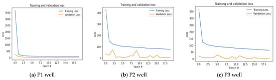 To avoid overfitting, AI algorithms employed have an early stopping nature. The losses during training and validation events are assessed at each iteration, which is shown in Figure 6 for three wells.