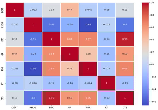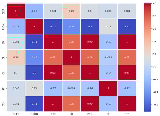 The data analyzed in this work were received from the public domain, RRC [58], where obtained data quality was relatively poor for some wells. This impacted the prediction performance in the current study. Consequently, long steps were taken to perform the hyperparameter tuning of the data. During data processing, missing data were filled immediately before the data point of specific features. The average computational times are given in Table 7. Time is a variable here since data points are different for each well. The resistivity value (RT) obtained from the deep induction log shows very skewness and abnormal statistical distribution indicating poor quality of the recorded data. The input RT significantly impacted the prediction as indicated in the correlation matrix illustrated in the heatmap in Figure 7 and Figure 8.