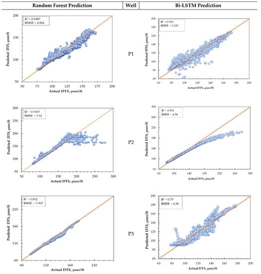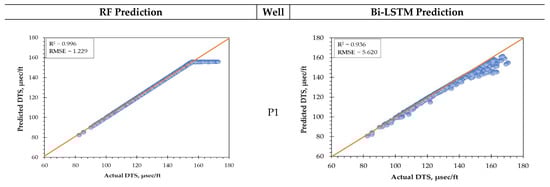 The R2 and RMSE of three wells predicted by these algorithms are presented in Table 5. P2 well achieves the best model performance predicted by RF algorithms with an R2 value of 99.90% and an error of less than 1% which is shown in Figure 9. Figure 10 shows the single well prediction using Bi-LSTM. Well P1 performs best of all three well using DL with an accuracy of 93.6%. In deep neural networks, Bi-LSTM exhibits lower accuracy compared to RF.