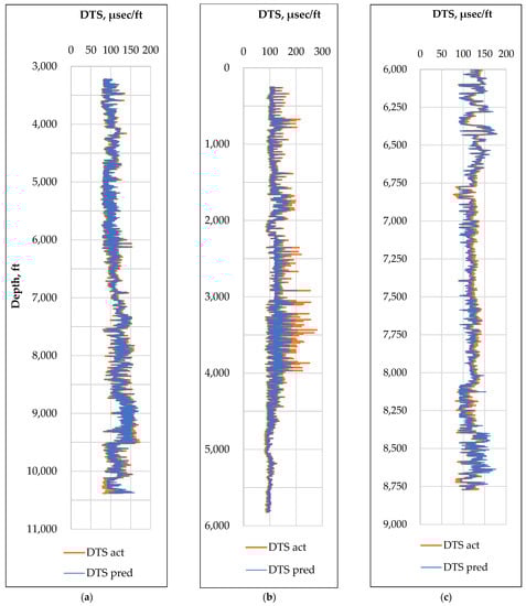 Five-fold cross-validation was used to evaluate the model. In each stage of iteration, a total of two wells were used to train the model, and the remaining third well was used to model testing and DTC prediction. Finally, the arithmetic average was calculated and reported for both R2 and RMSE. The DTS prediction results for grouped well are demonstrated in Figure 16 for all three wells. This prediction was successfully tested blindly. While training the model, the predicted data were withdrawn completely from the training datasets.