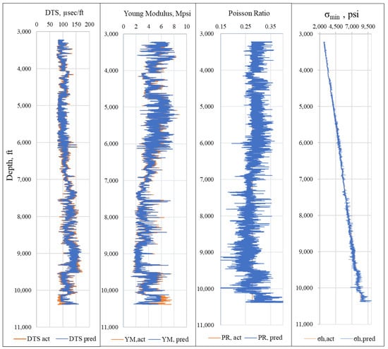 After blind validation and based on new prediction results, key elastic properties for the P1 well are calculated (Figure 18) using the following equation [55,56,57]. Overburden pressure is calculated using depth correlation, and pore pressure is assumed at 0.65 times the vertical depth.