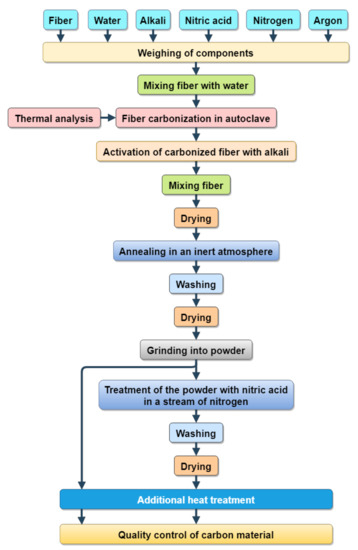 Hemp bast fiber was used as a precursor for the preparation of carbon. For theresearch, samples of porous carbon were produced according to the developed technological process (Figure 1).