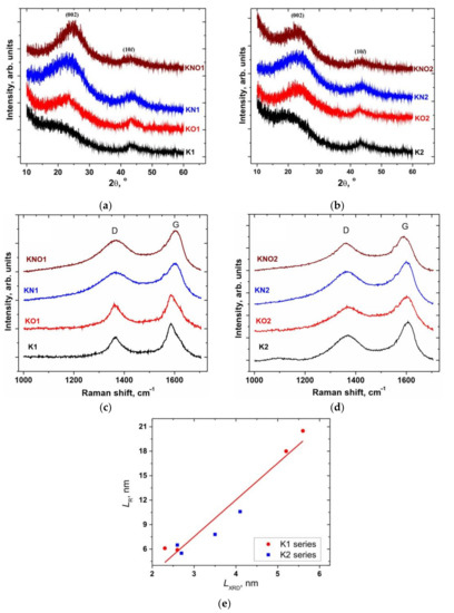 (a,b) XRD patterns and (c,d) Raman spectra of a series of carbon samples K1 and K2; (e) correlation map between the average lateral particle sizes calculated from the XRD and Raman data.