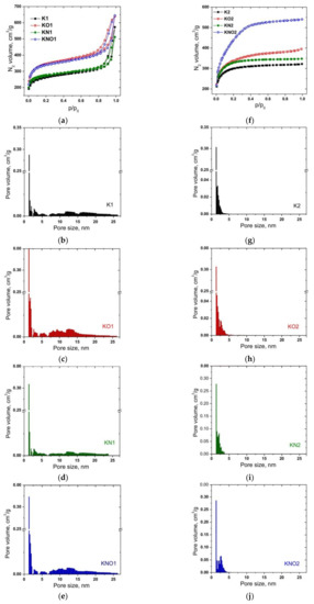 Narrow distributions of micropores with maxima at 1.3 nm wereobserved for all samples of both the K1 and K2 series. The pore size distribution curve for sample K1 (Figure 3b) demonstrated the presence of both micro- and mesoporous components (33% and 67% of the total pore volume, respectively). Micropores predominated in sample K2—the content of pores with an average diameter of more than 2nm wasonly 15% (Figure 3g). Thermal treatment caused an expansion of the range of micropores and a decrease in the content of mesopores to 61% for KO1, but the opposite trend wasobserved for sample KO2 (an increase in the content of mesopores to 31%) (Figure 3c,h). Treatment with nitric acid caused a decrease in the content of mesopores to about 56% for sample KN1, but for sample KN2, the effects of acid and thermal treatment werethe same (an increase in the content of mesopores to about 31%) (Figure 3d,i). Additional annealing of samples treated with nitric acid (KNO1 and KNO2) caused an increase in the content of mesopores to 62 and 54%, respectively (Figure 3e,j). Additional annealing and acid treatment caused an increase in the BET surface area as a result of the development of meso- and micropores, respectively. The observed difference can be explained by the burnout of small fragments with the disclosure of previously closed pores and etching of the particle surface.