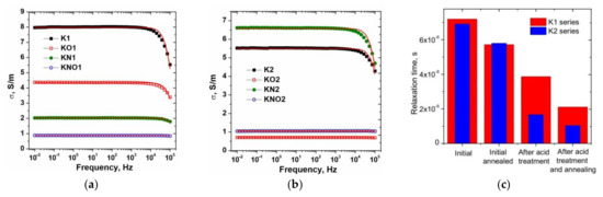 (a,b) Electrical conductivity spectra of carbon materials (solid lines are best-fit experimental data using Drude formula) and (c) comparison diagram of conductivity relaxation times of the carbon samples of the K1and K2 series at room temperature.