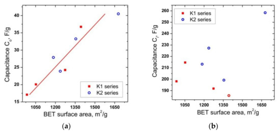 The dependence of the capacitance Co on the BET-specific surface area showed a high level of correlation (adjusted R-squared is about 0.85), which confirms the reliability of the used model (Figure 7a). In this case, no correlation between the capacitance Ci and the specific surface area of electrode materials wasobserved (Figure 7b)