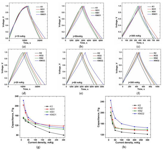 It is not surprising that the GCD curves for samples of the K1 and K2 series hada clear bend during charging and discharging due to the presence of “slower” processes at the electrode–electrolyte interface in pores with difficult access of electrolyte ions. The specific capacitance of the synthesized materials wascalculated from the charge–discharge curves (obtained in a three-electrode configuration) using the following equation: , where I is the discharge current, Δt is the discharge time, m is the mass of active materials (g), and ΔU is the potential discharge window. The maximum values of the specific capacitance current density of 15 mA⋅g−1 were also obtained for KNO1 and KNO2 carbons after both acid and additional thermal treatment—221 and 245 F/g, respectively (Figure 8g,h). The K2 series materials showed a correspondingly higher performance with increasing current density.