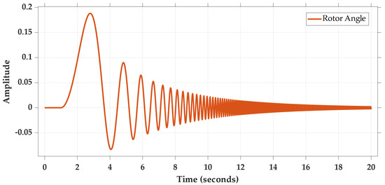 To validate the proposed MRAC-based oscillation damping controller, the synchronous generator was subjected to various contingencies. They varied from setpoint changes in its two inputs, namely and , to faults. Furthermore, to emulate small variations in loads that are mainly responsible for inter-area oscillations, internal disturbances were added. Notwithstanding the type of disturbances, the rotor angle maintained a considerably stable response, with an overshoot of less than 5%, a rise time less than 100 ms, non-existent steady-state error, and a good recovery time of less than 800 ms. This recovery time was achieved when the generator was subjected to disturbances in the form of a normally (Gaussian) distributed random signal with a variance of 1 and 0.001 sample time, setpoint changes, as well as faults. The latter were introduced at the third and ninth second for a duration of 100 ms and 300 ms, respectively. The synchronous generator, through its rotor angle, remained stable irrespective of the contingencies. Furthermore, considering the time of interest is 3–5 s for standard power systems and 10 s for large ones with weak interconnections, the proposed novel scheme is very robust. The various test cases together with their results are summarized in Table 1. Characteristics such as the rotor angle’s rise time, overshoot, and recovery time are presented therein. Nevertheless, this can be further refined by taking into consideration the penetration of RES into power system grids as they affect the overall system inertia.