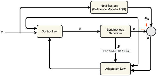 Designing a controller for a given system implies learning how that very system behaves physically, and this is oftentimes achieved through its mathematical representation [30]. As shown in Equation (6), the synchronous generator dynamics possess parameter variations that are due to their very nonlinear structure. Hence, reducing the system uncertainty as much as practically possible is of the utmost importance. This section is structured as follows. Firstly, an overview of the composition of such a controller is introduced. Thereafter, the structure of the MRAC for the synchronous generator is presented. Two classes of adaptive control schemes are generally identified: the direct and indirect methods [30,40,41]. Though either one of the classes are used in adaptive control architectures, often, they are combined and referred to as composite [30,41], combined, or hybrid-direct adaptive control [30,42]. Further reading in relation to the MRAC can be found in [30,40,43], with Figure 2 showing the structure of the MRAC system. The proposed controller uses the direct method.