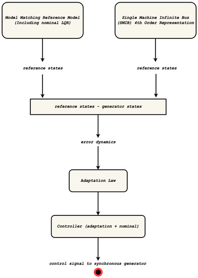 Figure 3 depicts the steps followed in the design of the proposed controller. An LQR controller is applied to the model matching reference model. The error dynamics are then used in the adaptation law which, combined with the nominal controller (LQR), constitute the control signal.