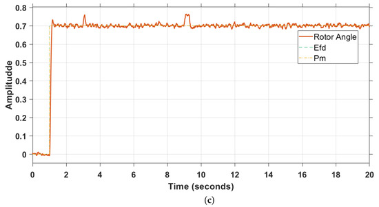 The results are presented in the form of case studies starting from the steady state condition. The performance of the proposed algorithm is assessed by setpoints change, disturbances in the input signal, and faults at t = 3 s and t = 9 s, as well as the introduction of internal disturbances. These are assumed to have the characteristics of Gaussian noise with a variance of unity and a sample time of 0.001. Furthermore, they are aimed at replicating low-frequency inter-area oscillations caused by small variations in loads. The simulations are conducted with no initial conditions, and the initial set-points are and . Figure 4, Figure 5, Figure 6, Figure 7, Figure 8 and Figure 9 show the system response for each of the case studies. With angle instability being the root cause of inter-area oscillations, the system’s response in this section will refer to the rotor angle’s response. A detailed summary of parameters used in the simulations can be found in Appendix B.