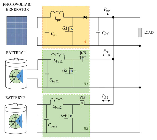 where is the power of the photovoltaic panel and and are the power received or injected by the batteries. Equation (13) can be rewritten according to the operating state of the ESS, shown in the sign. When the battery operates in discharge mode, it injects or delivers power to the MG-DC (Boost mode) and its sign is positive, and when the batteries operate in charge mode, they consume energy (Buck mode) and its sign is negative, whereby is the power demanded to supply the MG-DC load.
