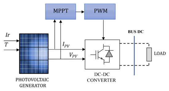The photovoltaic (PV) panel comprises a combination of solar cells in series and parallel, which distribute the required voltage and current under normal conditions. The current and voltage properties of a solar panel are nonlinear and depend on the solar radiation, and for a set amount of solar radiation, there is a maximum power point corresponding to the voltage at which the PV can provide its maximum energy. This study uses a disturb and observe method for MPPT control [30]. The general scheme of the proposed controller is shown in Figure 2.