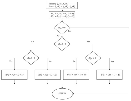 In this section, the photovoltaic panel controller algorithm is designed (Figure 1). The control objective is to maximize the solar resource using an MPPT control based on the perturb and observe (P & O) technique [31]. The implementation of the controller is shown in Figure 3, where the duty cycle is obtained from the algorithm described in Figure 4, sending this signal to the PWM that controls the converter.