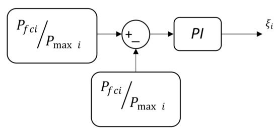 To correct the power sharing among batteries while respecting the voltage restoration, the controller in is included in based on the consensus algorithms described in Equation (11). Its specific design is presented in Figure 9, where is the control action generated by the PI controller described in Equation (11). This control action is incorporated into the control levels already described (Figure 3), in which (11) can be rewritten as Equation (12), where .